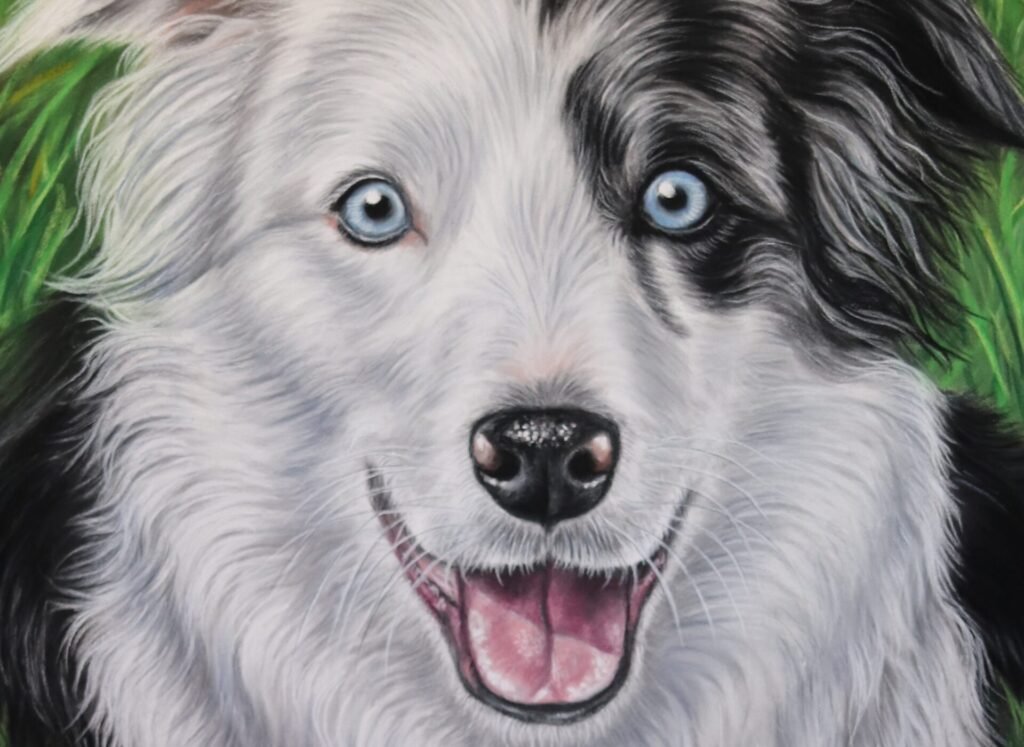 A commissioned dog painting is one of the most personal and meaningful pieces of art you can own. Recently, I completed a custom portrait of a beautiful Blue Merle Border Collie – Harvey. And this commission perfectly reflects why hand-painted dog portraits remain so special and timeless. Every commission dog painting tells a story — not just of the dog’s appearance, but of their character, soul, and the bond they shared with their family.