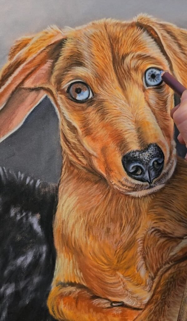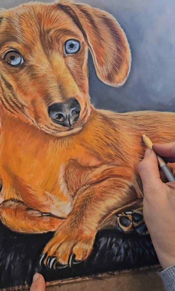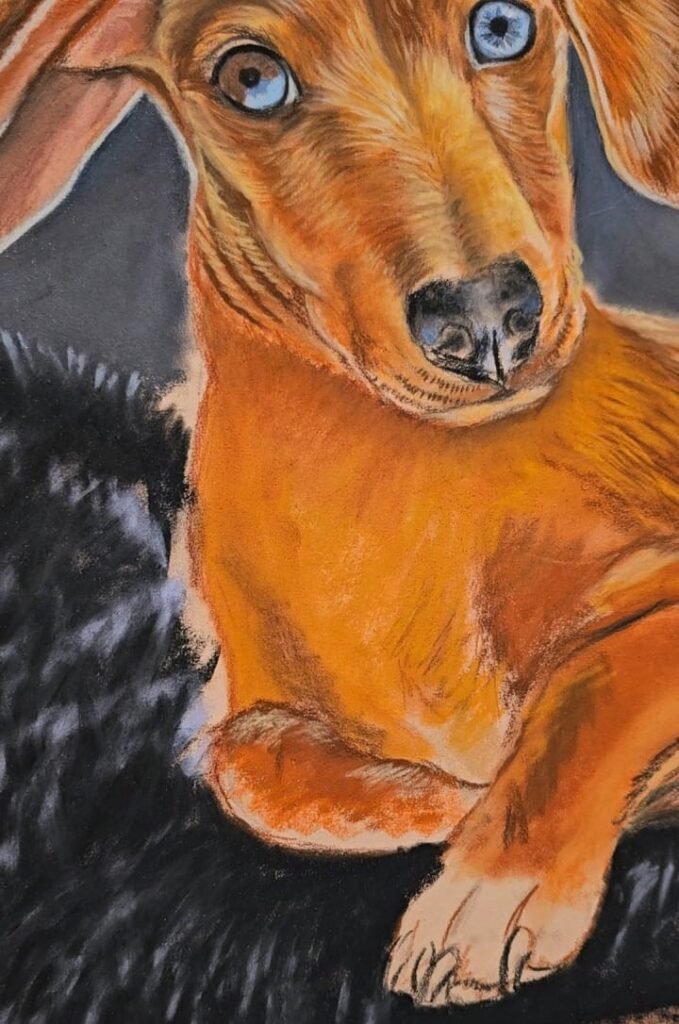 Using professional-grade pastels ensures that the colours stay vibrant and strong for many years, as long as the artwork is properly framed and cared for. Pastel portraits are a wonderful choice for clients who want a highly detailed, soft and expressive custom dog portrait. They are also a more affordable option compared to oil or acrylic dog portrait paintings, while still offering exceptional depth and realism.
